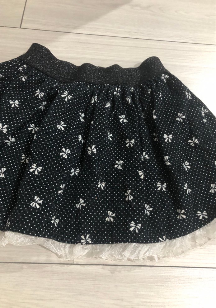 Siyah renkli kız çocuk eteği, bol kesim ve fırfır detaylara sahiptir. Yumuşak kadife kumaştan üretilmiş, hafif fiyonk desenlidir.