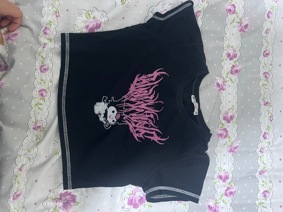 Kız çocukları için siyah, baskılı, gotik tarzda, kısa kollu ve dar kesim tişört. Sentetik kumaştan üretilmiştir.