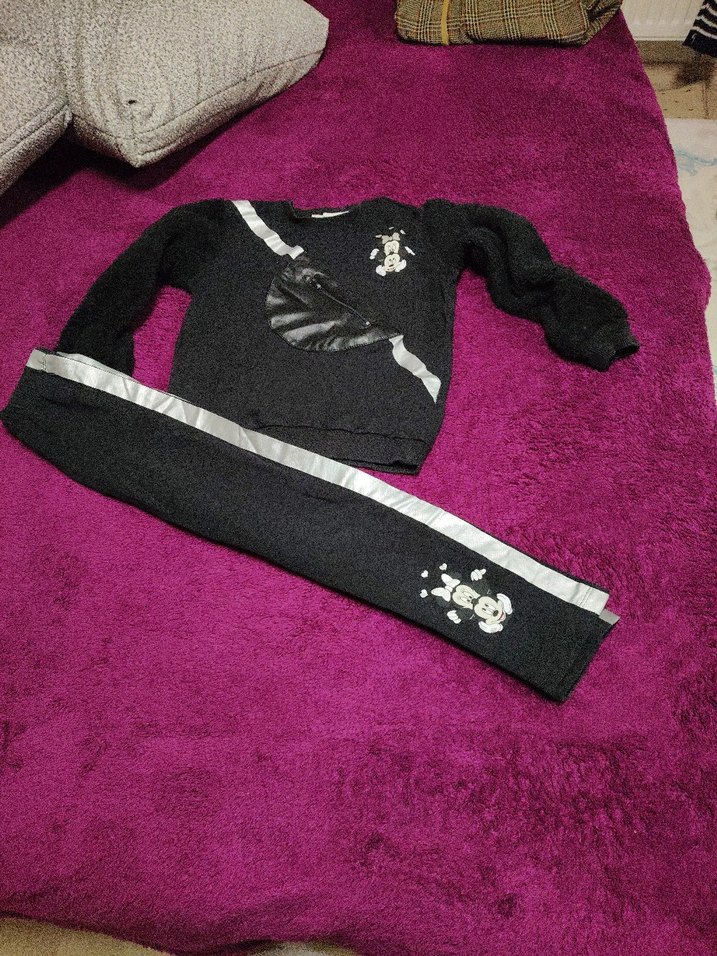 Kız çocukları için siyah, goth tarzı, baskılı kafatası desenli, kadife kumaştan yapılmış, yapışkan bant detaylı ve bisiklet yaka uzun kollu sweatshirt ile eşofman takımı.