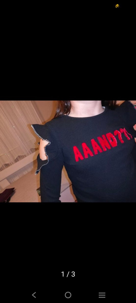 Kız çocukları için siyah, triko, fitted kesim bluz. Uzun kollu, omuzlarda kesik detaylı, önünde kırmızı "AAAND?" baskısı bulunur.