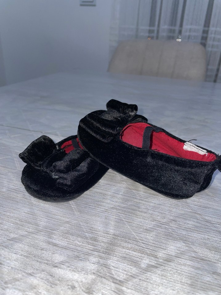 Kız çocukları için siyah gotik tarzda, Velcro kapamalı ve kauçuk tabanlı babetler, yumuşak koyu dış yüzey ve kırmızı iç astar ile.