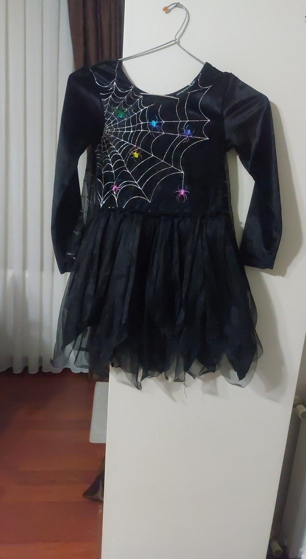 Uzun kollu, siyah gotik tarzda kız çocuk elbisesi. İşlemeli örümcek ağı deseni ve dantel detayları bulunur. Straplez yaka ile tamamlanmıştır. ️