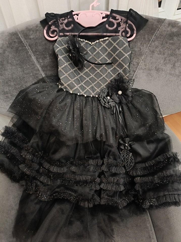 V yaka ve askılı siyah gotik elbise, desenli gövde ve simli, fırfırlı etekle tasarlanmıştır. Sentetik kumaştan yapılmıştır. 7 yaş bir sefer giyildi
