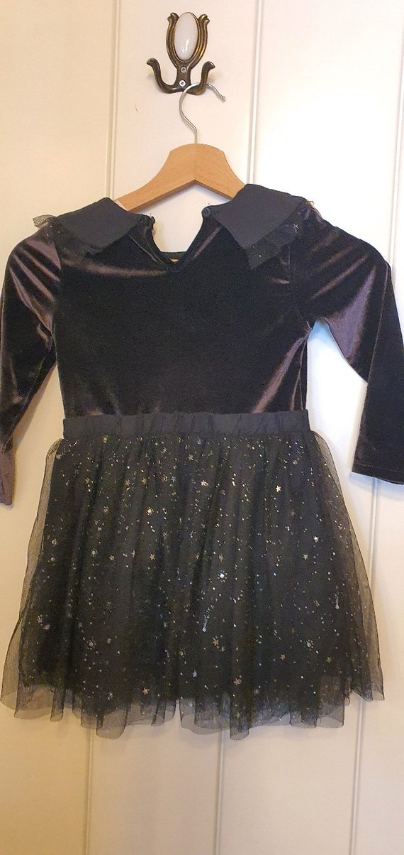 Bu siyah gotik elbise, kız çocukları için dar kesim, yakalı ve uzun kolludur. Fırfır detayları ve yıldız desenli tül etekle şık bir görünüm sunar. Yumuşak sentetik kumaştan yapılmıştır.