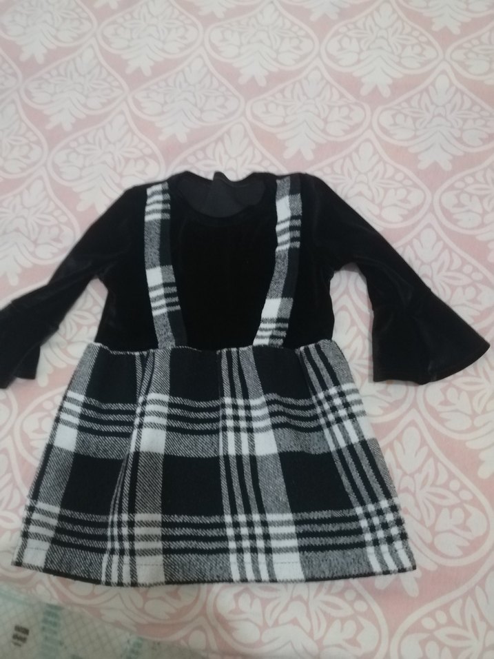 Kız çocuk için siyah ve gri ekose desenli, uzun kollu, yuvarlak yakalı ve bol kesim elbise. Yumuşak, örme kumaştan yapılmıştır, rahat ve günlük bir tarz sunar.