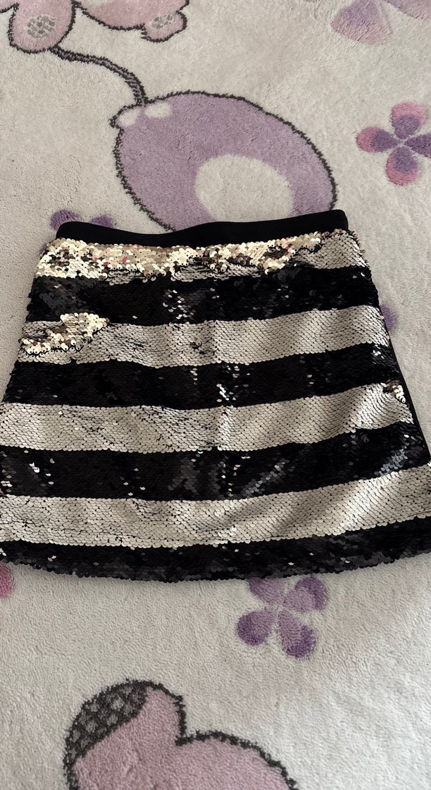 Siyah ve gri payetli çizgili, sentetik kumaştan yapılmış dar kesim mini etek. Parti için uygun, rock punk tarzında.