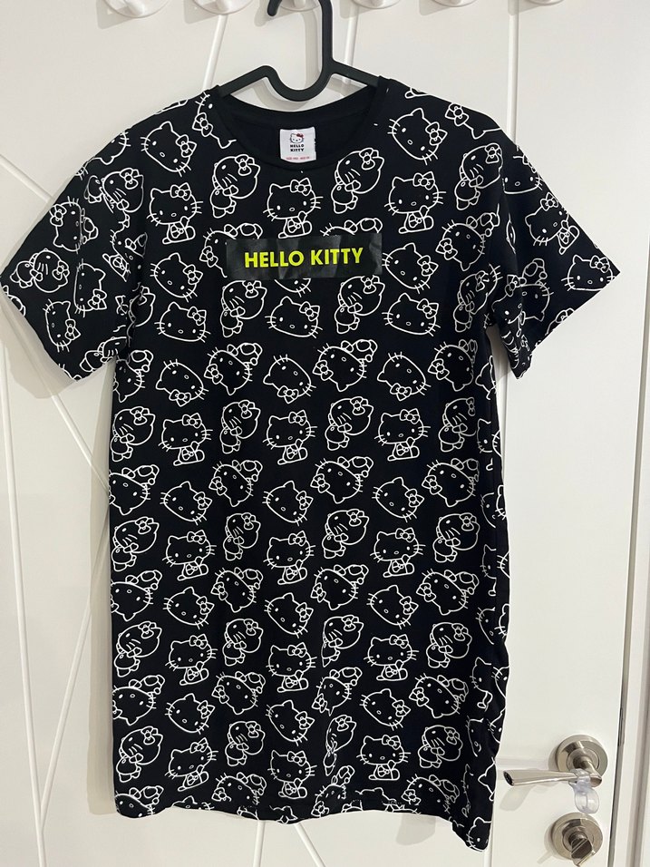 Siyah renkli kız çocuk tişörtü, kısa kollu ve yuvarlak yaka. Pamuklu örme kumaştan, bol kesim, Hello Kitty baskılı ve sarı "HELLO KITTY" yazılıdır. Yeni ürün etiketsiz. 9-10 yaş.