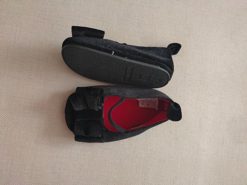 Kız çocuklar için siyah babet ayakkabılar, yumuşak üst kısmı ve kauçuk tabanı vardır. Kolay kapanan bant ve sade, düz tasarıma sahiptir. 20 numara