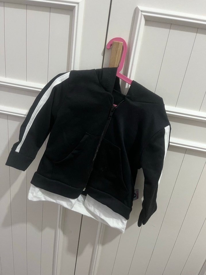 Kız çocukları için siyah kapüşonlu, fermuarlı ve bol kesim ceket. Kol kısmında beyaz şeritler bulunur. Rahat ve sıcak tutan kumaştan üretilmiştir. Ürünün kumaşı çok ince o sebepten fiyatı uygun tutuyorum