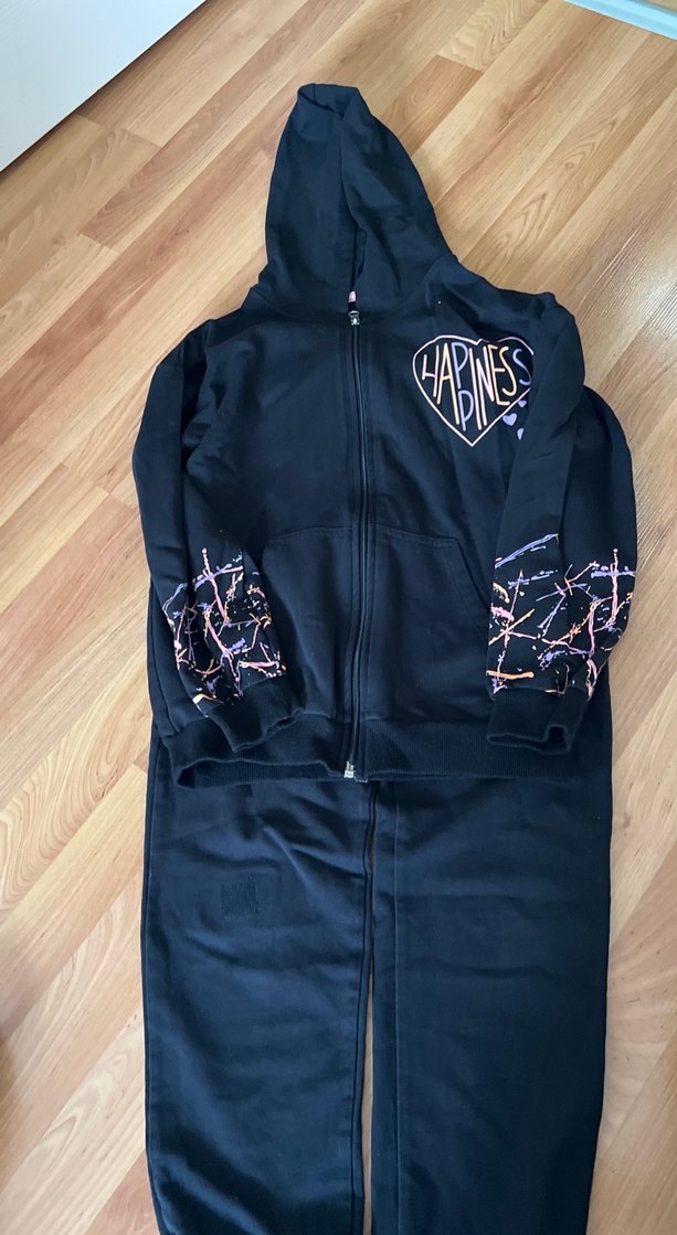Siyah kapüşonlu sweatshirt, bol kesim ve fermuarlı. Kollarında baskı ve göğüste 'Happiness' yazılı kalp deseni bulunur. Yumuşak ve sıcak kumaştan, sokak stili için uygun.