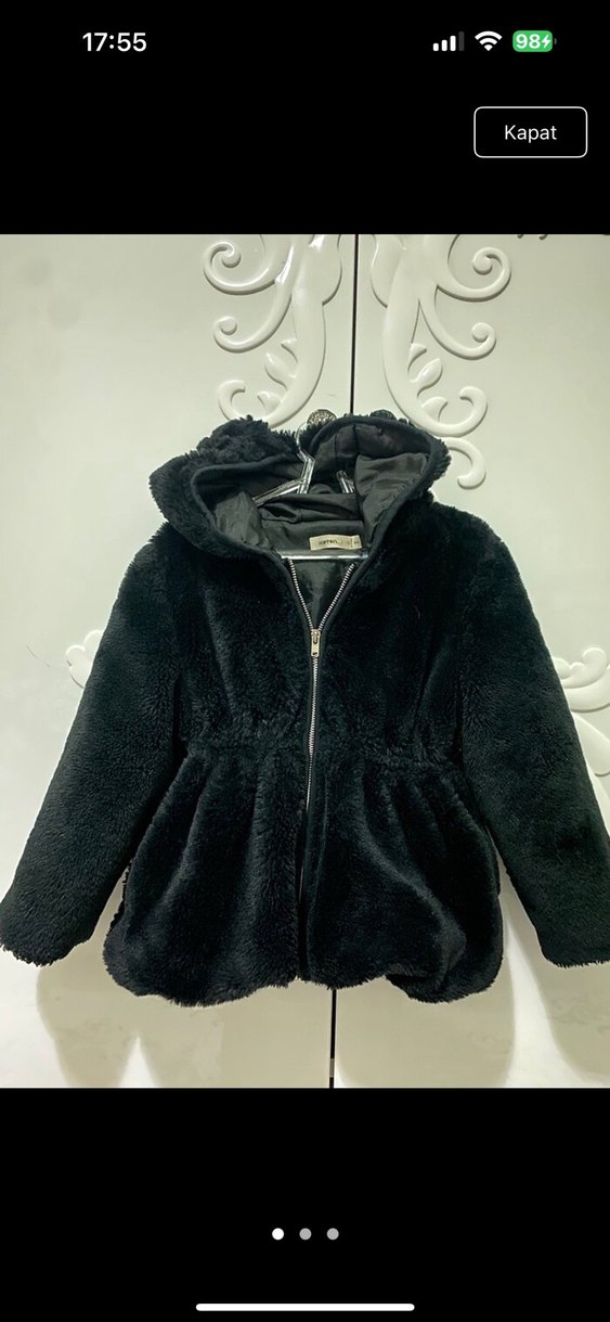 Kız çocukları için kapüşonlu, kürk detaylı siyah mont. Sıcak ve yumuşak dokulu, düz ve gotik tarzda, fermuarlı ve vücuda oturan kesim.