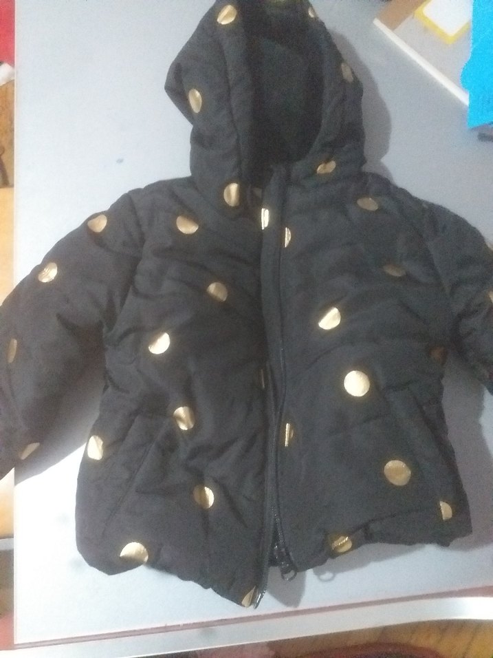 Kız çocukları için kapüşonlu, düğmeli siyah mont, altın renkli puantiyelerle süslenmiştir. Yumuşak ve sıcak kumaştan, sokak stili için uygundur.