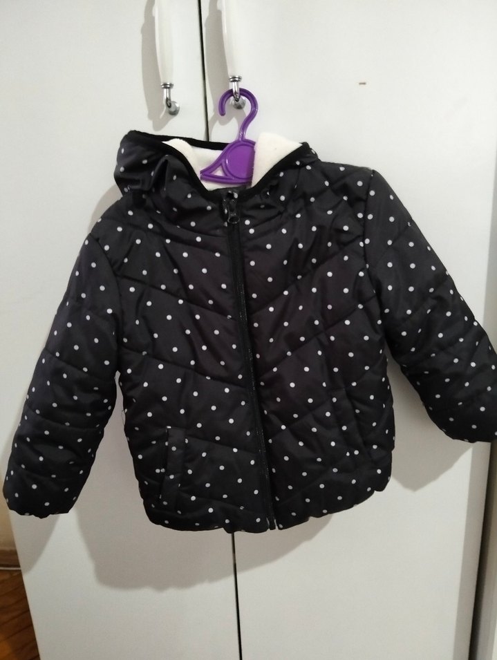 Kız çocukları için kapüşonlu, düğmeli ve beyaz puantiyeli siyah mont. Yumuşak ve sıcak kumaştan, günlük sokak tarzına uygun.