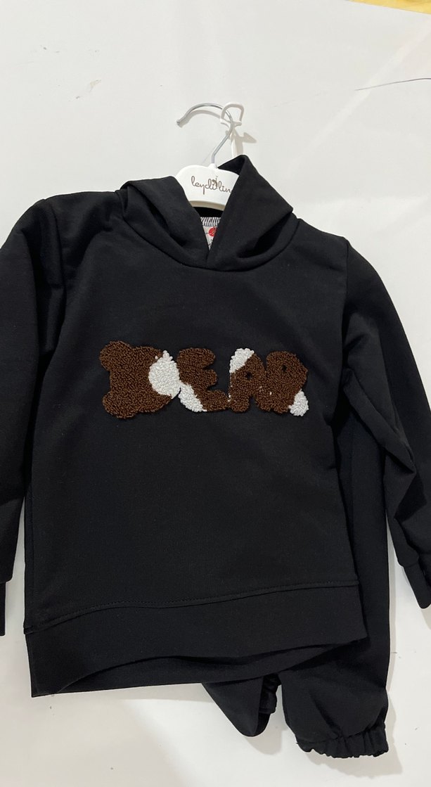 Kız çocuklar için siyah, uzun kollu, bisiklet yaka sweatshirt. Kahverengi ve beyaz işlemeli kürk detaylarıyla rahat ve trend bir stil sunar.