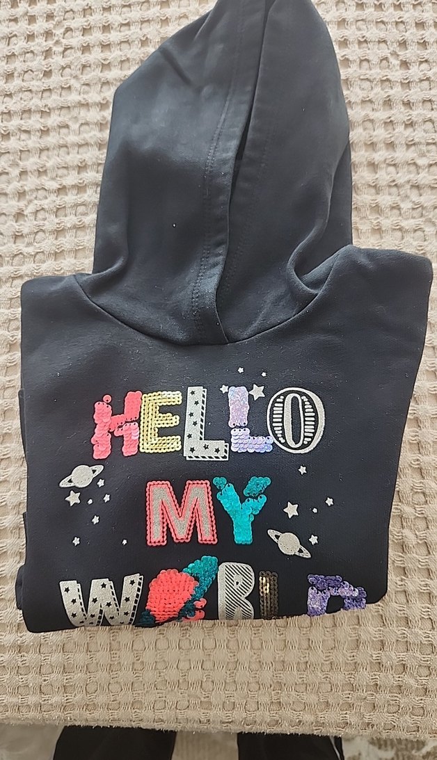 Yumuşak kumaştan, uzun kollu ve kapüşonlu siyah sweatshirt. Renkli ve simli "HELLO MY WORLD" baskısı bulunur. Rahat ve şık sokak stili için uygundur. 3-4 yaş
