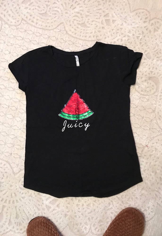 Siyah, kısa kollu, bol kesim kız çocuk tişörtü. Karpuz baskısı ve dantel detayları bulunur. Sentetik kumaştan, yuvarlak yaka.
