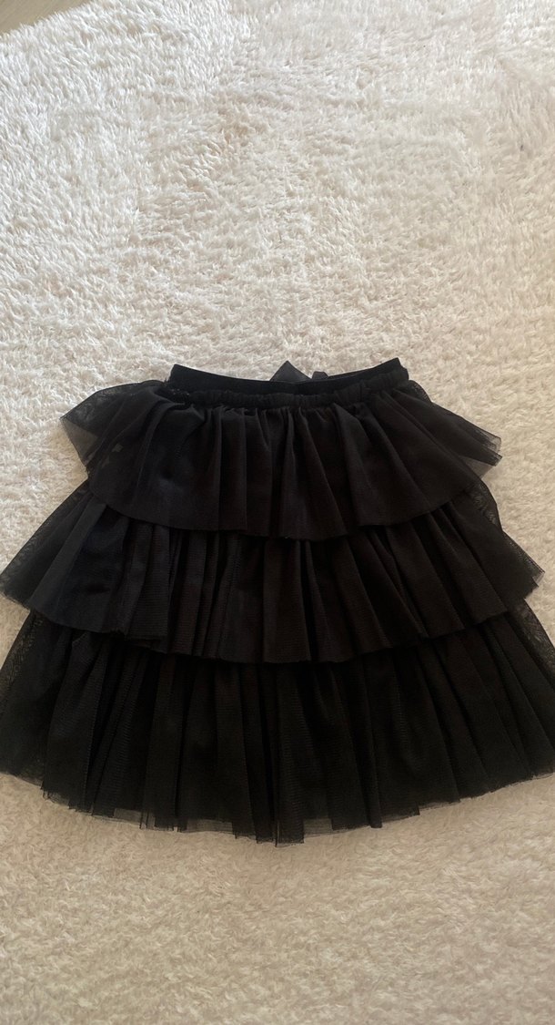 Siyah renkli, kat kat fırfırlı ve bol kesim kız çocuk eteği, yumuşak sentetik kumaştan yapılmıştır.