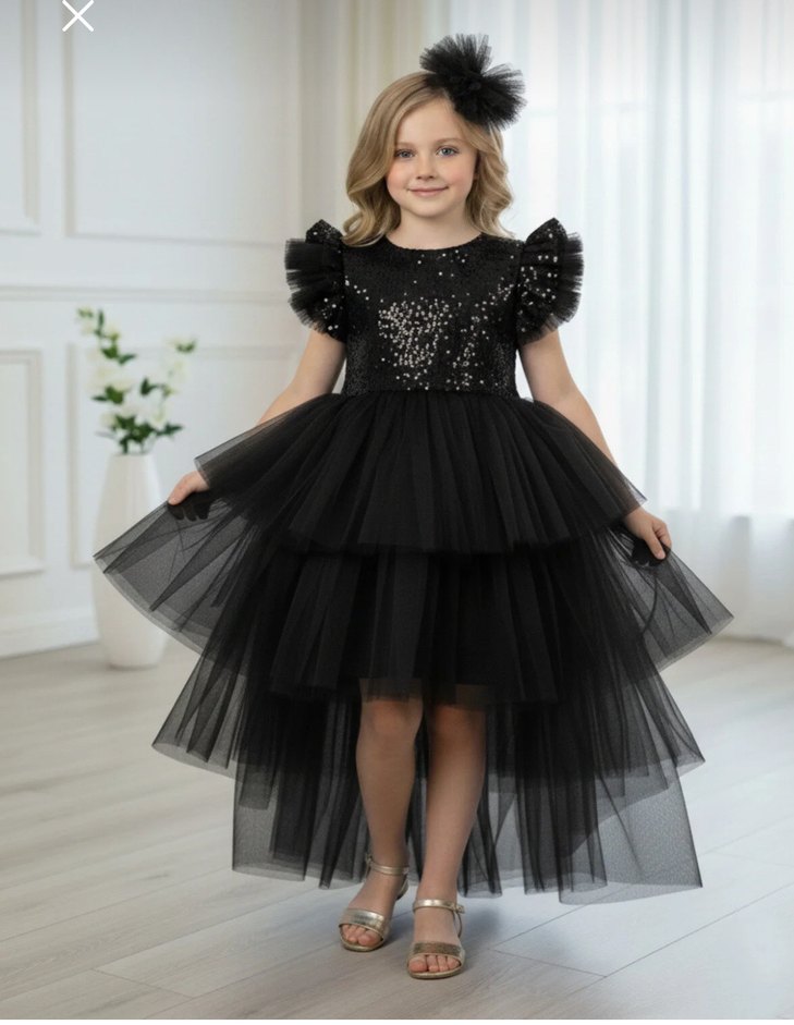 Kısa kollu, volanlı ve işlemeli detaylara sahip, straplez yaka ve kat kat tül kumaştan yapılmış siyah, klasik şıklıkta kesimli elbise. Kız çocuk Payetli abiye 8 yaş 1 kez kullanıldı sıfır ayarında tekliflere açığım