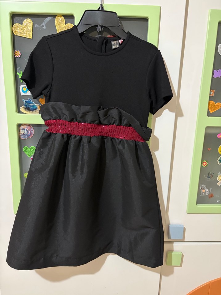 Kemerli, kısa kollu, yuvarlak yaka ve baskılı desenli siyah kız çocuk elbisesi. Sentetik kumaştan, goth tarzına uygun.