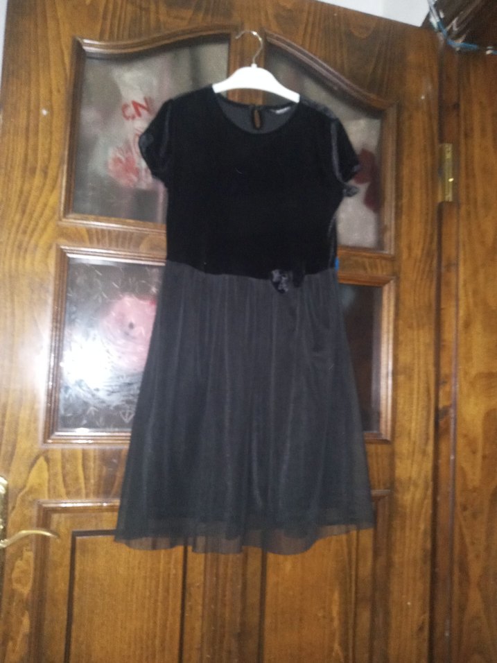 Siyah renkli kız çocuk elbisesi, kısa kollu ve yuvarlak yakalıdır. Yumuşak sentetik kumaştan yapılmış, kemerli ve bol kesimdir.
