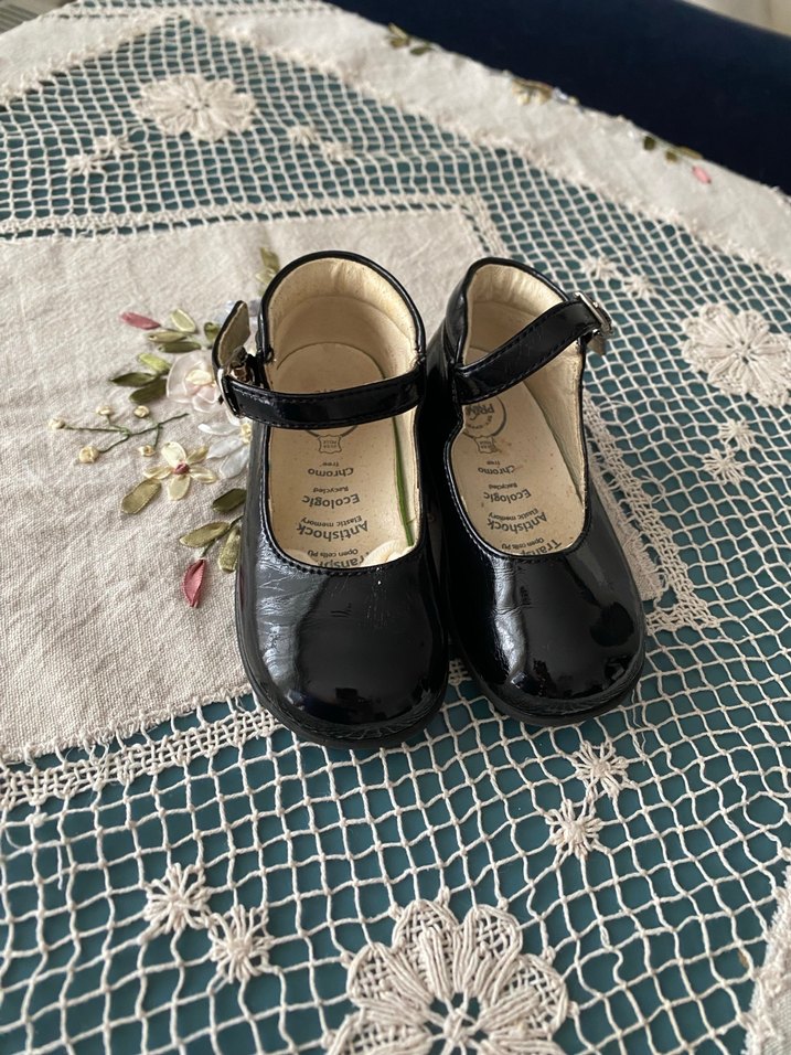 Kız çocukları için siyah, kemerli, rugan görünümlü lastik babet. İnce yılan derisi deseni ve gotik tarz içerir. 21 numara cok temiz durumda . Urun ortapediktir