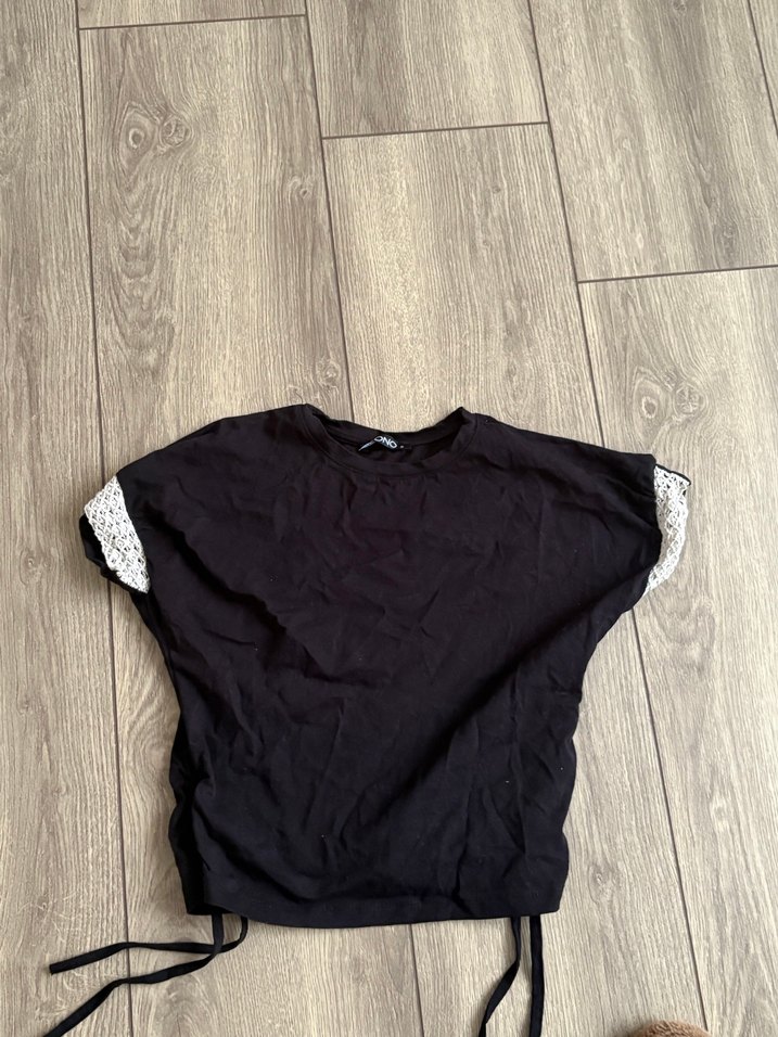 Kız çocuk siyah keten tişört, kısa kollu ve dantel detaylıdır. Salaş kesimi ve yuvarlak yaka ile gündelik sokak stili için uygundur.