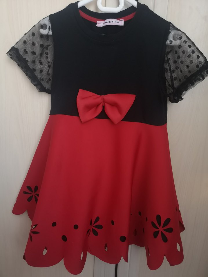 kız çocuk elbisesi, siyah tül puantiyeli kısa kollu üst ve çiçek desenli kırmızı etek ile belde fiyonk detayına sahiptir.