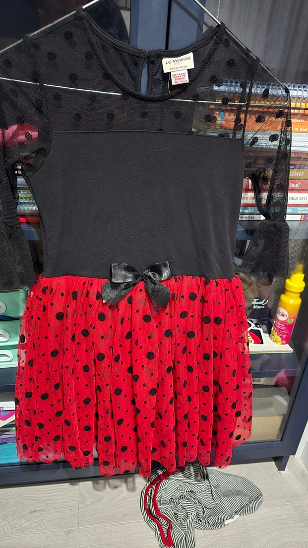 Kız çocuk için straplez yakalı, ince askılı, siyah üst ve kırmızı üzerine siyah puantiyeli, fiyonk detaylı etek kısmı bulunan, sentetik kumaştan yapılmış, gotik tarzda, oturan kesim elbise.