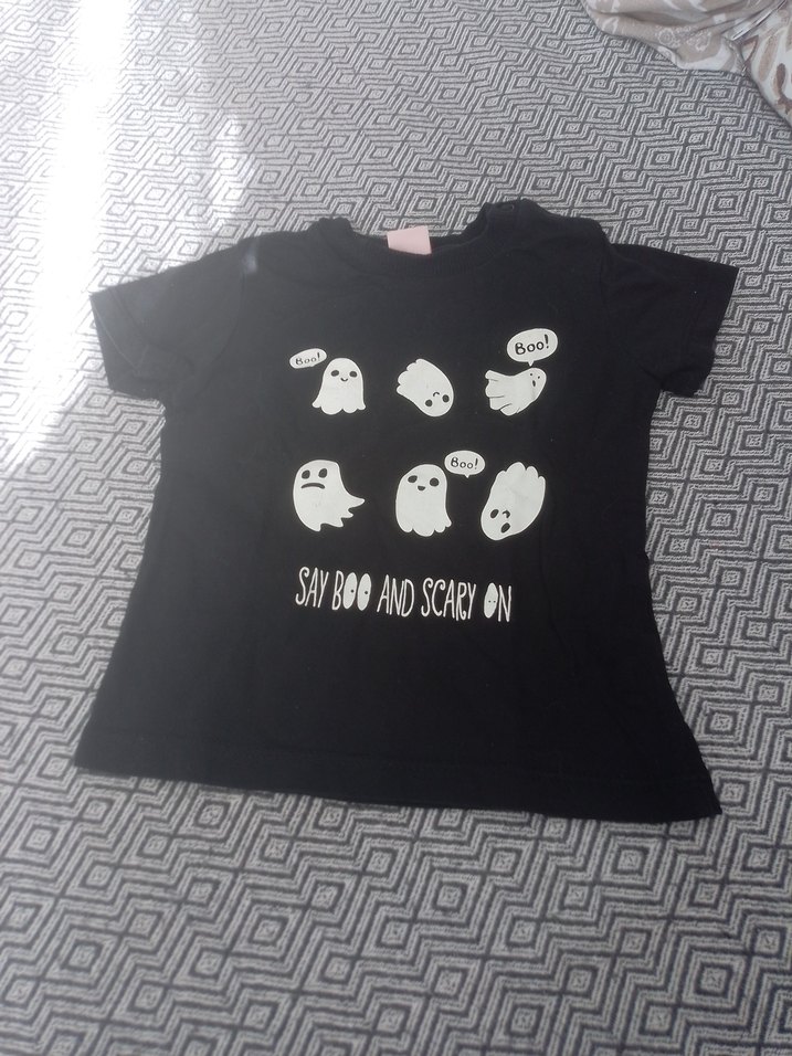 Pamuklu, siyah, kısa kollu, bol kesim tişört. Üzerinde 'Say Boo and Scary On' yazılı baskılı hayalet figürleri bulunur. Bisiklet yaka, rahat tarz .