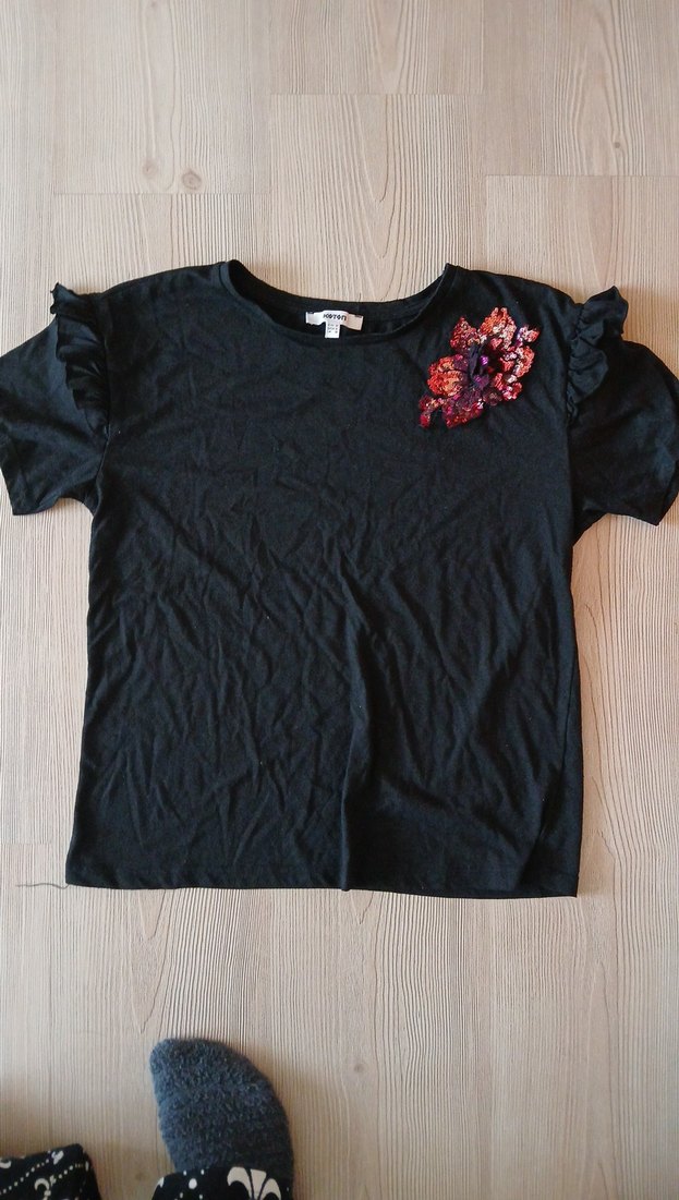 Siyah renkli kız çocuk tişörtü, kısa kollu ve fırfırlı detaylara sahiptir. Yakada baskılı çiçek deseni bulunur, bol kesim ve yuvarlak yakalıdır.