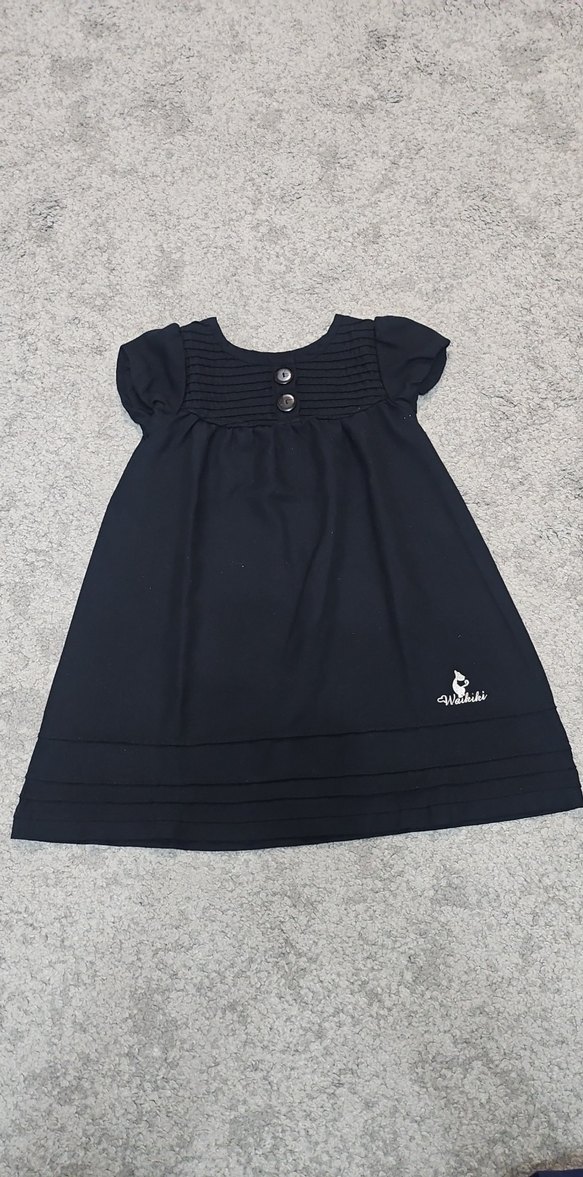 Siyah kız çocuk elbise, kısa kollu ve yuvarlak yakalıdır. Pamuklu kumaştan yapılmış, bol kesim ve pile detayları bulunur. Düz, gotik tarzda.
