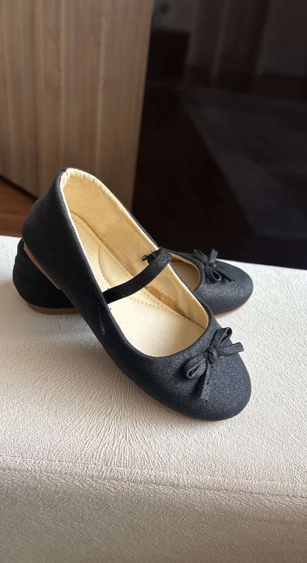 Kız çocuklar için siyah renkte, tokalı bantlı ve sade fiyonk detaylı, rahat kauçuk babet ayakkabı.