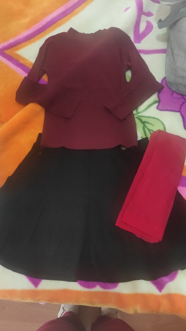 Kız Çocuk siyah kloş etek bordo body ve kırmızı külotlu çorap