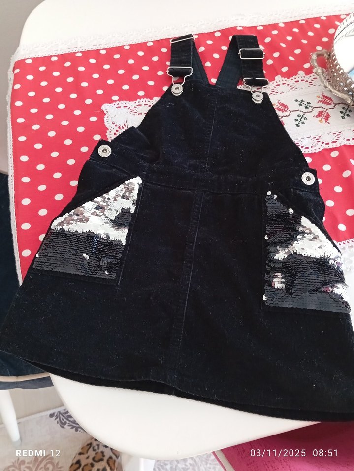 Siyah kot kumaştan, askılı ve tokalı, işlemeli detaylı, parlak payetli cepleriyle goth tarzı kız çocuk tulumu.