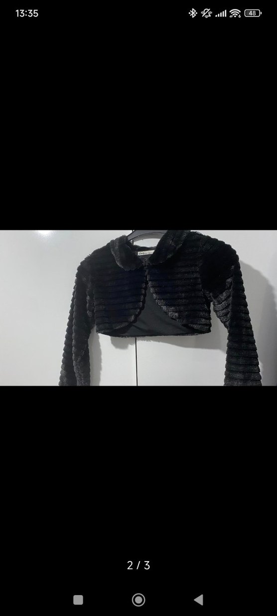 Uzun kollu, straplez yakalı ve siyah kürk detaylı, vücuda oturan kız çocuk bolero.