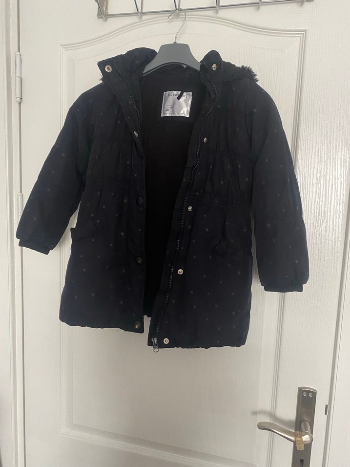 Kız çocuklar için siyah, kürklü kapüşonlu ve kesimli yakalı, yumuşak ve sıcak kumaştan yapılmış sokak stili kaban. Kullanılmış üründür fakat kullanıma engel hıcbır sıkıntıs yoktur