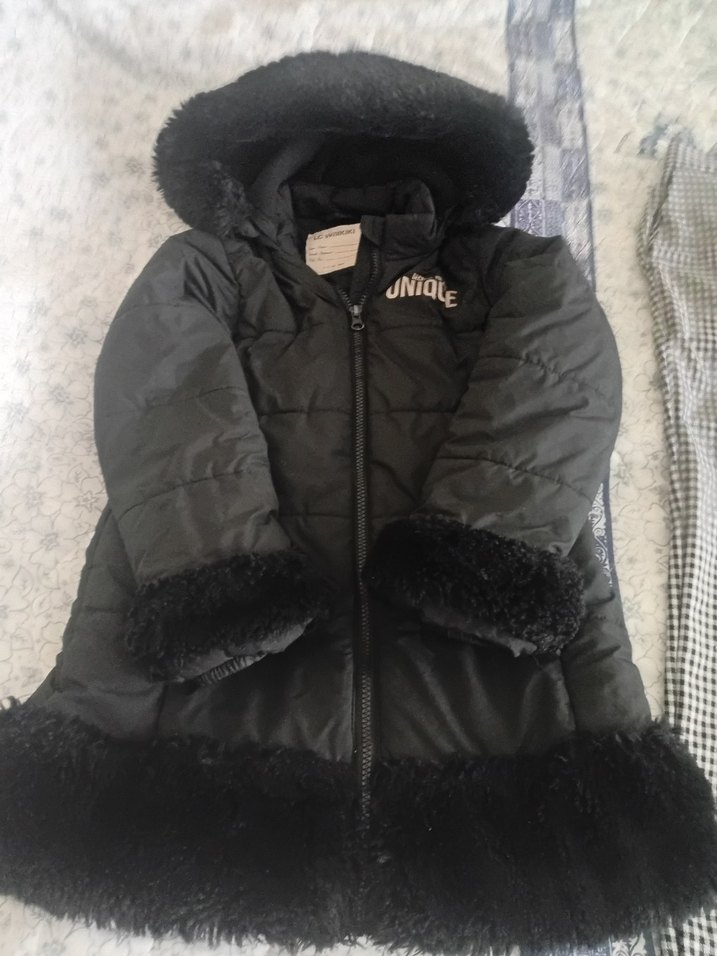Kız çocukları için siyah, kürklü detaylı, yumuşak ve sıcak fleece kumaştan, oturmalı kesime sahip kaban. Yakası kesik ve gotik tarzda.
