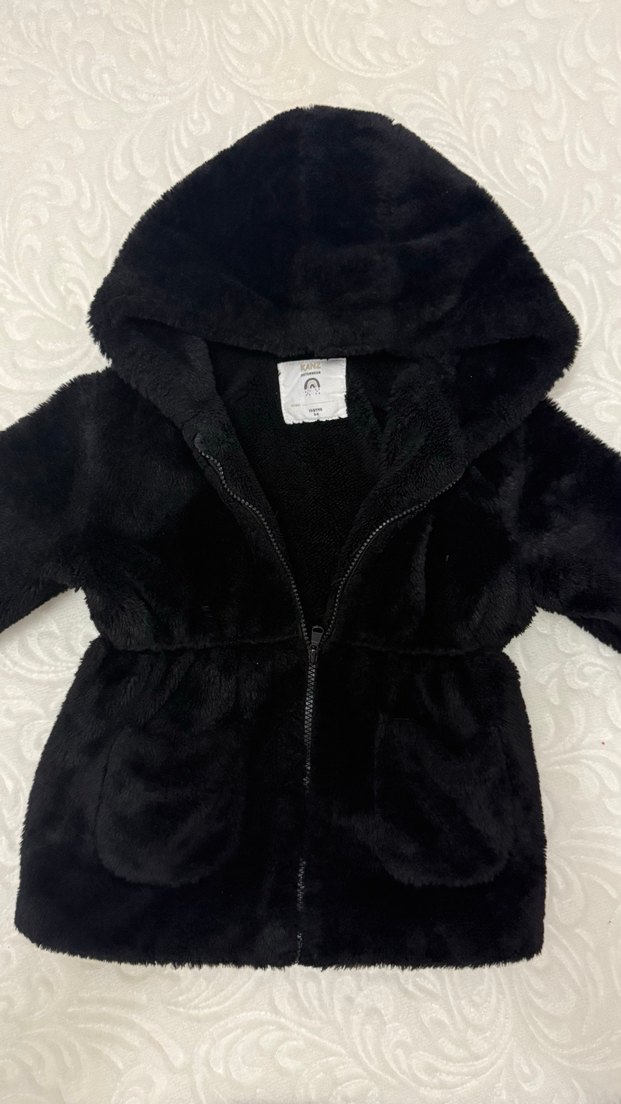 Siyah kapüşonlu kız çocuk montu, yumuşak kürk detaylı ve kalıplı kesimlidir. Sade, koyu goth tarzında, sıcak ve peluş dokulu kumaştan yapılmıştır. Kolunda çok ufak dikme işlemi vardır belli bile olmuyor