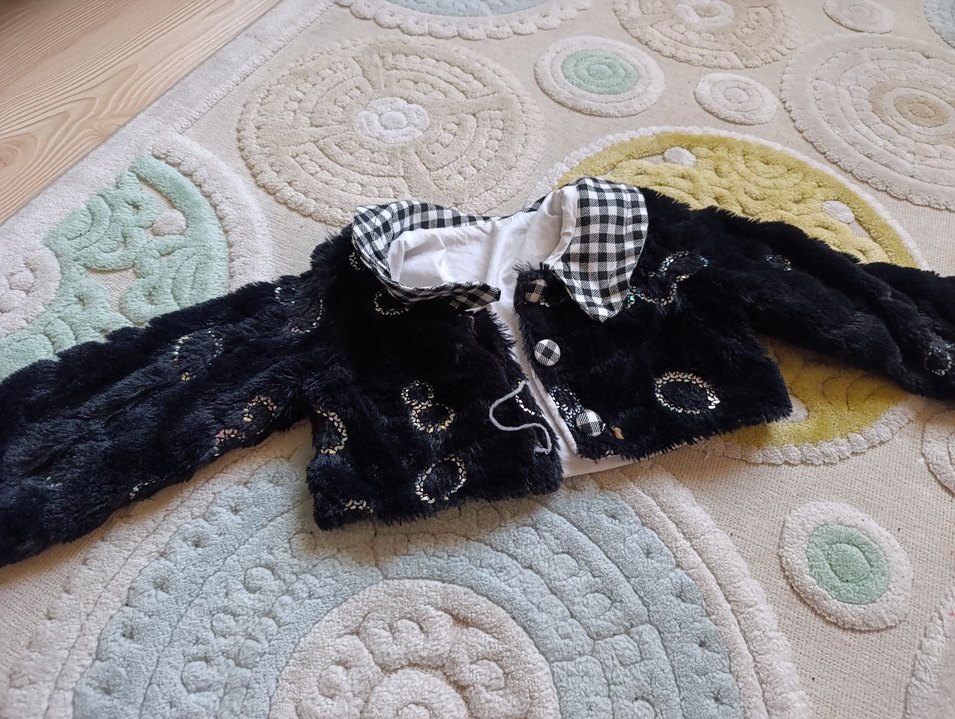 Kız çocuklar için siyah, kürk detaylı, nakışlı ve kareli yakalı, uzun kollu, dar kesim goth tarzı bolero.