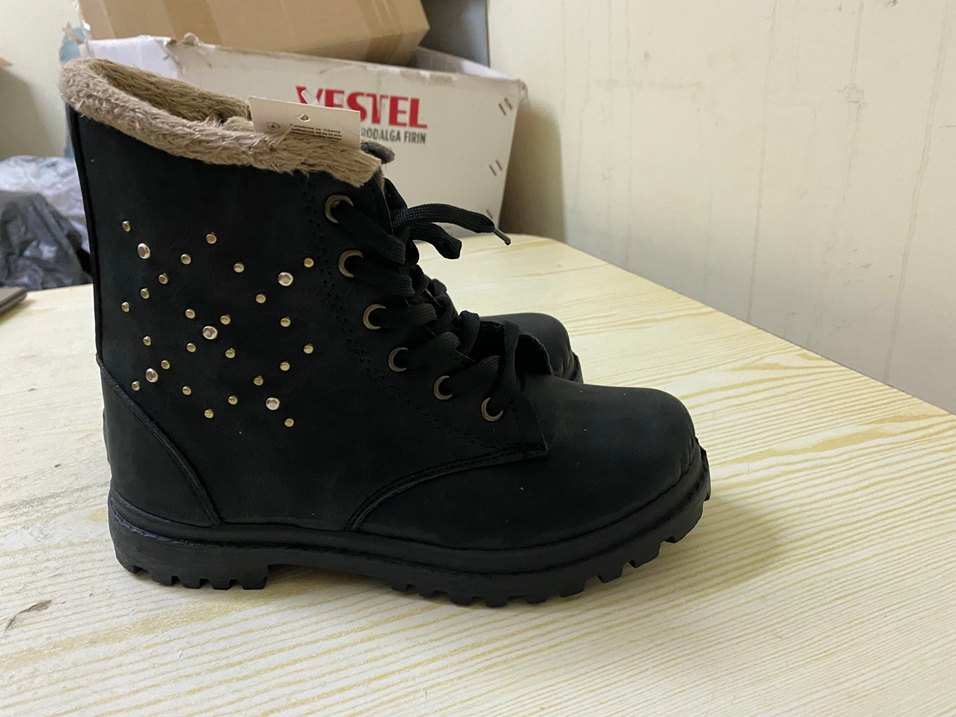 Siyah kauçuk kız çocuk botları, kürklü astar ve nakış detaylı, rock punk tarzında. Sağlam tabanlı ve bağcıklı tasarım.