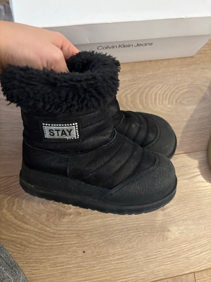 Kız çocukları için siyah kauçuk botlar, bilek kısmında kürk detaylı ve sade tasarımlı. "STAY" yazılı yama bulunur, trend sokak stiline uygundur. Yemiz yandan fermuarlı