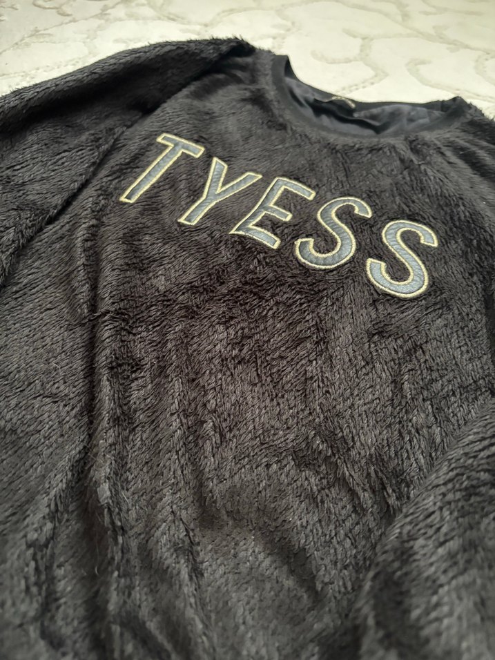 Siyah renkli, uzun kollu ve bol kesim kız çocuk sweatshirtü, yumuşak kürk dokusuna ve yuvarlak yakaya sahiptir. Önünde "TYESS" baskısı bulunur, rahat ve şık bir sokak stili sunar.