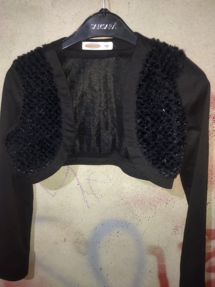 Kız çocukları için siyah bolero, uzun kollu ve kürklü işlemeli detaylara sahip. Straplez yaka ve fit kesimiyle goth tarzını yansıtıyor. genişlik 30 cm kol uzunluğu 38 santim normal uzunluk ise 24 santim