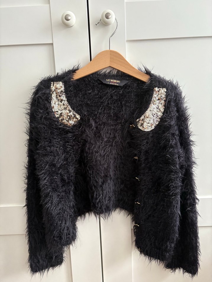 Kız çocukları için siyah renk, uzun kollu, yuvarlak yakalı, bol kesim, kürklü ve nakışlı detaylara sahip bohem ve gotik tarzda triko bolero .