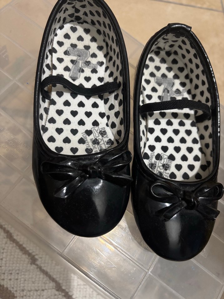 Kız çocukları için siyah lastik babetler, önünde klasik bir fiyonk ve kalp desenli iç taban ile gotik ve klasik şıklığı bir araya getirir.