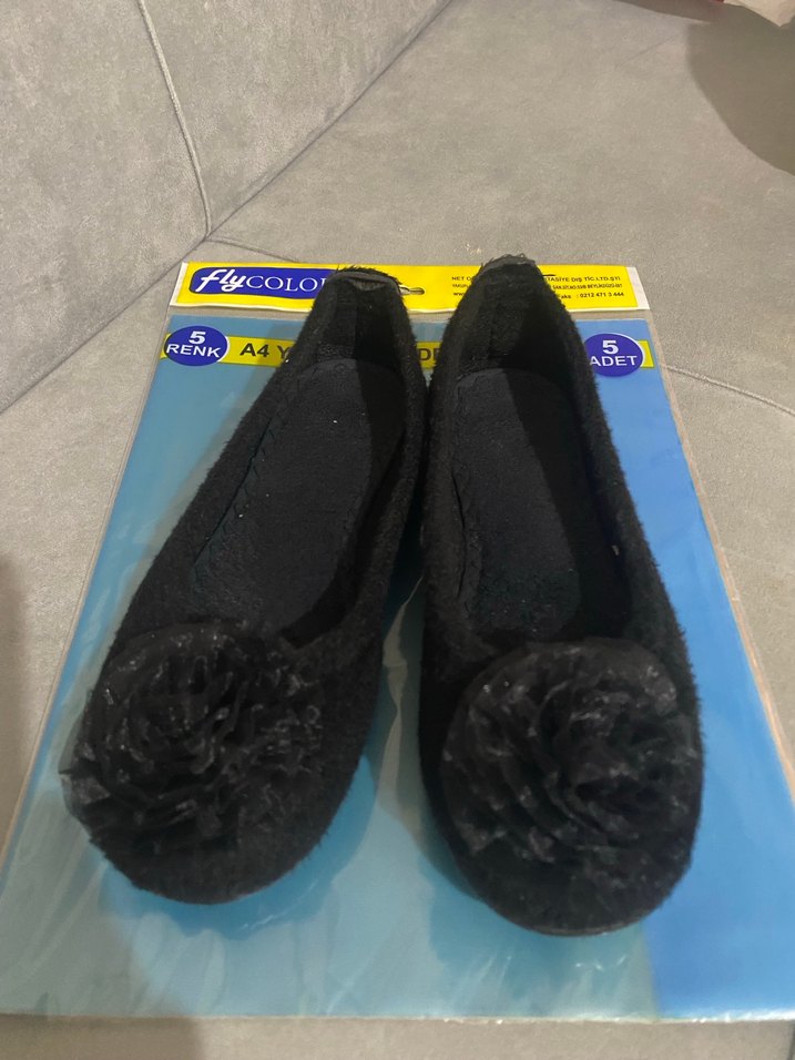 Kız çocukları için siyah, lastikli, kauçuk babet ayakkabılar. Gots tarzında, uç kısmında çiçek süslemeli, desensiz model.