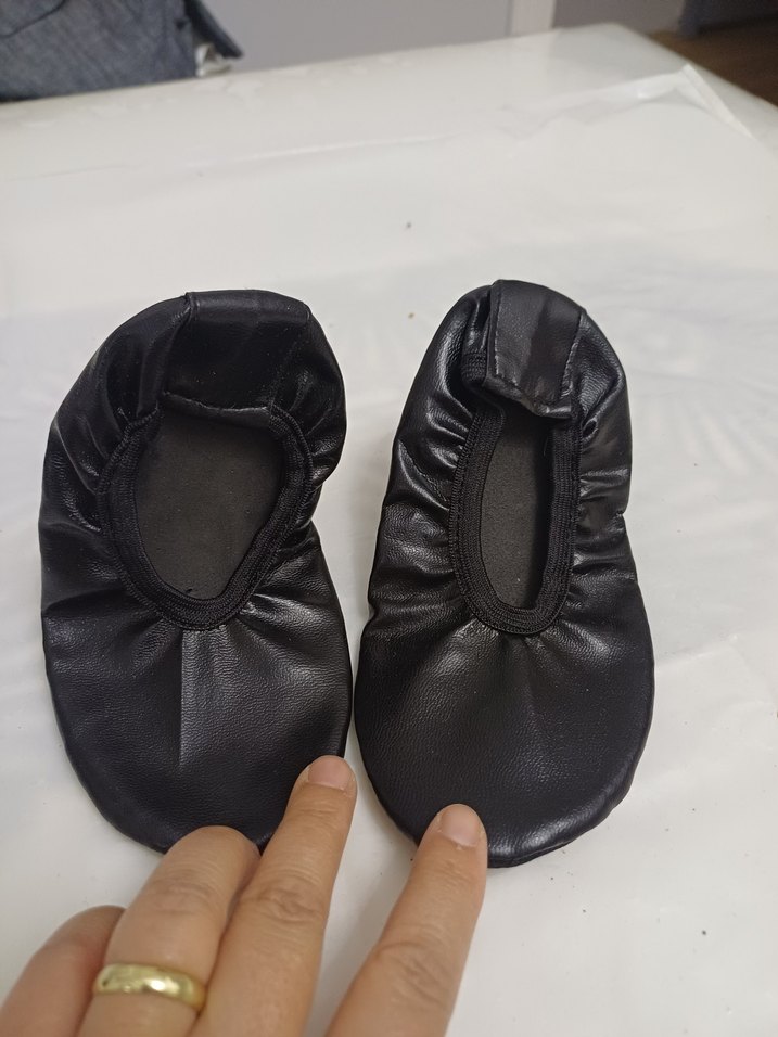 Kız çocukları için siyah, lastikli, yumuşak kauçuk malzemeden yapılmış bale ayakkabısı. Düz ve gotik tarzda sade ve koyu renkli tasarım.