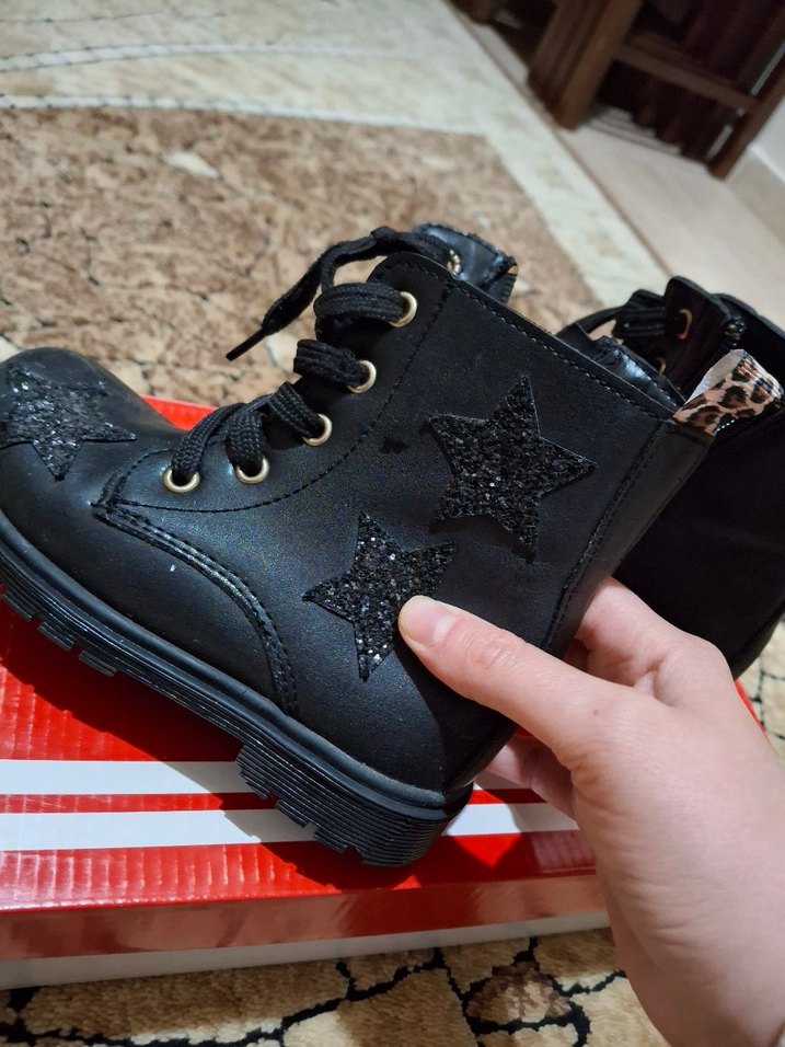 Siyah kız çocuk botları, kauçuk tabanlıdır ve yumuşak kürk ile parıltılı yıldız desenleriyle leopar desenli punk tarzı sunar. çok az kullanıldı yeni gibi