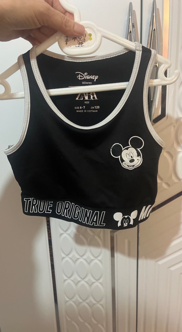 Kolsuz, dar kesim siyah crop top. Mickey Mouse baskılı ve 'TRUE ORIGINAL' yazılı, ayarlanabilir cırt cırtlı. Zara Kids markasına ait.