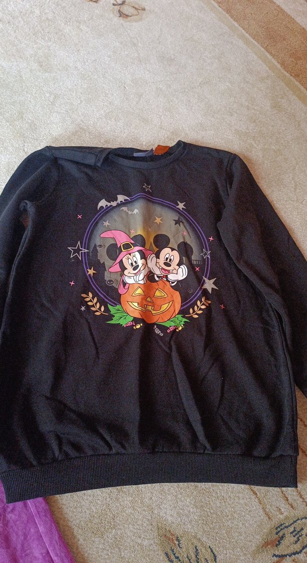 Kız çocukları için siyah sweatshirt, uzun kollu ve yuvarlak yaka. Gevşek kesim, içi polar ve Halloween temalı Mickey baskılı. Yumuşak ve sıcak kumaştan yapıldı.